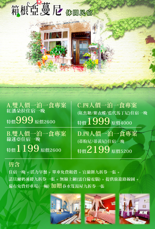 只要999元起,即可享有【宜蘭-箱根亞蔓尼】〈含A.紅潘朵拉/B.綠迷亞/C.(紅焦糖/紫衣蝶/藍代馬丁尼)/D.(蒂粉尼/蒂黃尼) 住宿一晚 + 活力早餐 + 單車免費租借 + 宜蘭餅九折券一張 + 諾貝爾奶凍捲九折券一張 + 無線上網(需自備電腦) + 提供旅遊路線圖 + 備有免費停車場(一輛)〉加贈春水笈湯屋九折券一張